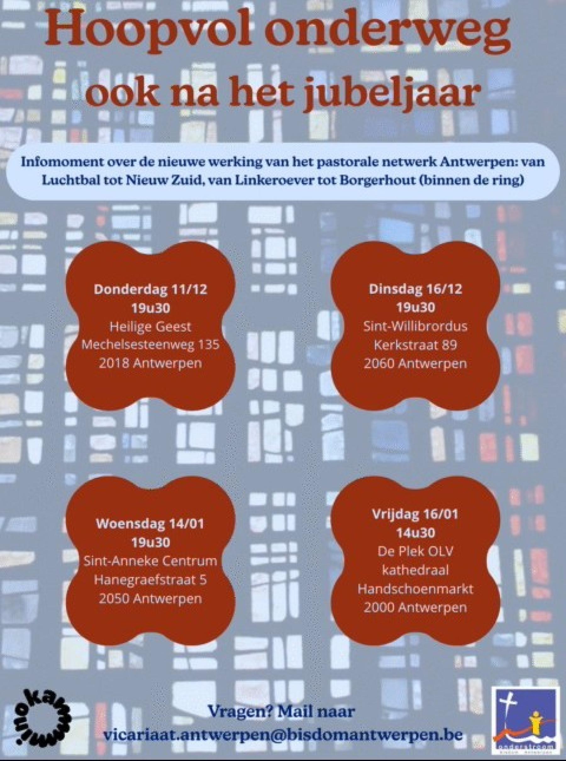 Op vrijdag 16 januari 2026 om 14.30 u. vindt er in de Onze-Lieve-Vrouwekathedraal een infomoment plaats over de nieuwe werking van het pastorale netwerk Antwerpen, onder het motto: 'Hoopvol onderweg, ook na het Jubeljaar'.